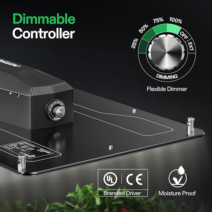 • Convenient Dimmable Ballast: This LED grow light has a dimming knob that makes it adaptable to different periods of your plant growth by adjusting its output from 25% to 100%