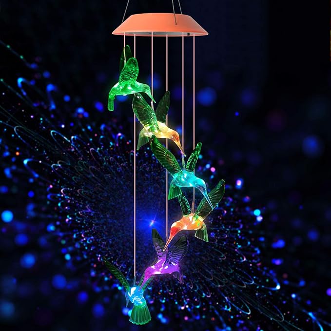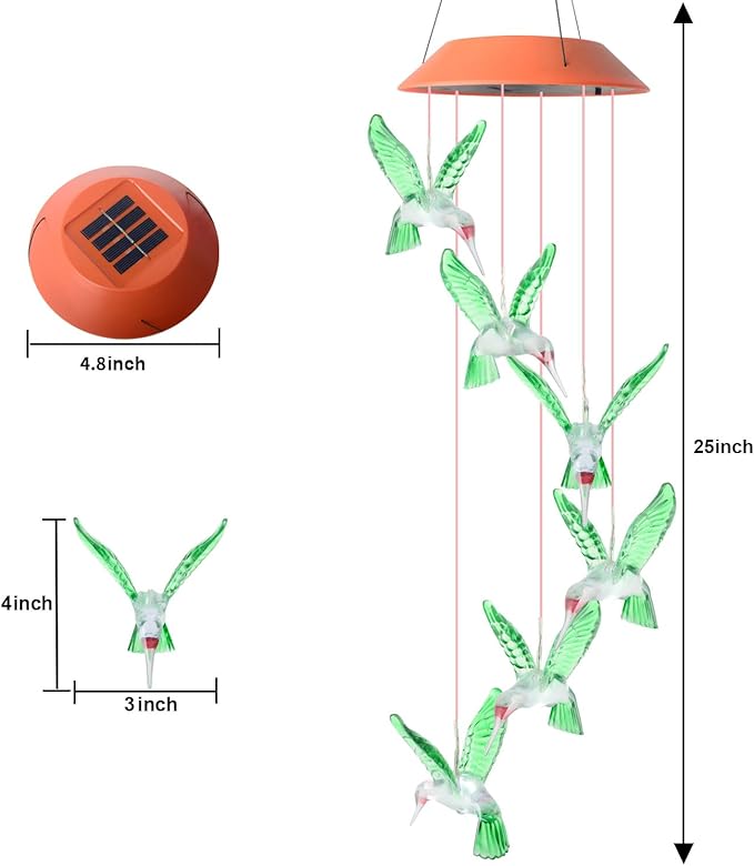 • 【SOLAR POWER】 The solar panel stores natural energy to illuminate the hummingbird without electricity. Our outdoor wind chime light is the waterproof and durable, great for hanging up at your garden or patio.Easy to use and convenient to hang up, no wire or USB needed. No maintenance required. Simply let nature power the hummingbird Wind Chimes. And if you like environment friendly product, this is the one for you!