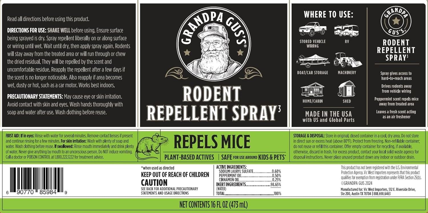 Grandpa Gus's Rodent Repellent Spray, Peppermint & Cinnamon Oil, Prevents Mouse/Rats from Nesting & Chewing on Wires, 16 fl oz (Pack of 1)