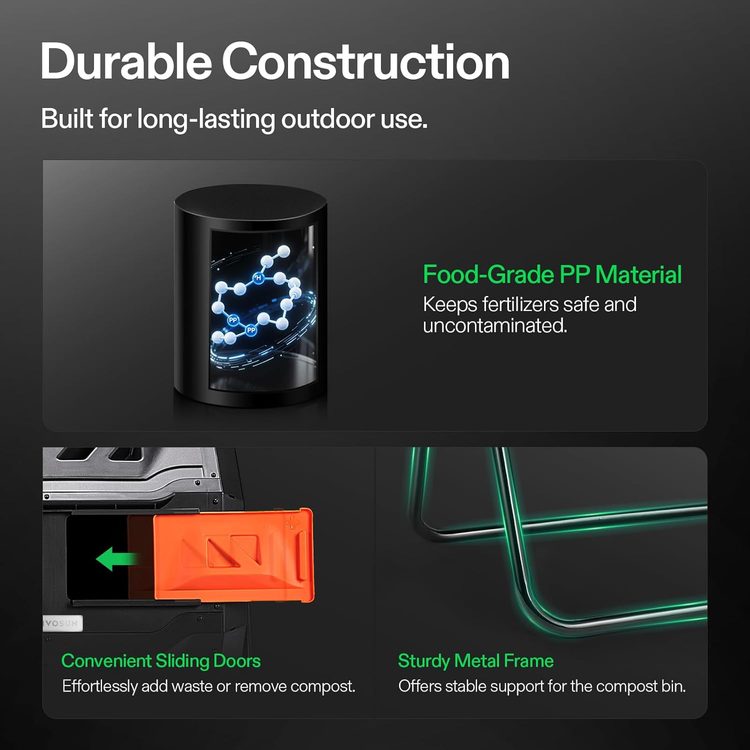 • Sturdy & Durable Construction: Constructed of premium metal frame and high-quality pp plastic body, this tumbling composter is corrosion-resistant, weathering-resistant, sturdy, and durable for long-lasting service life