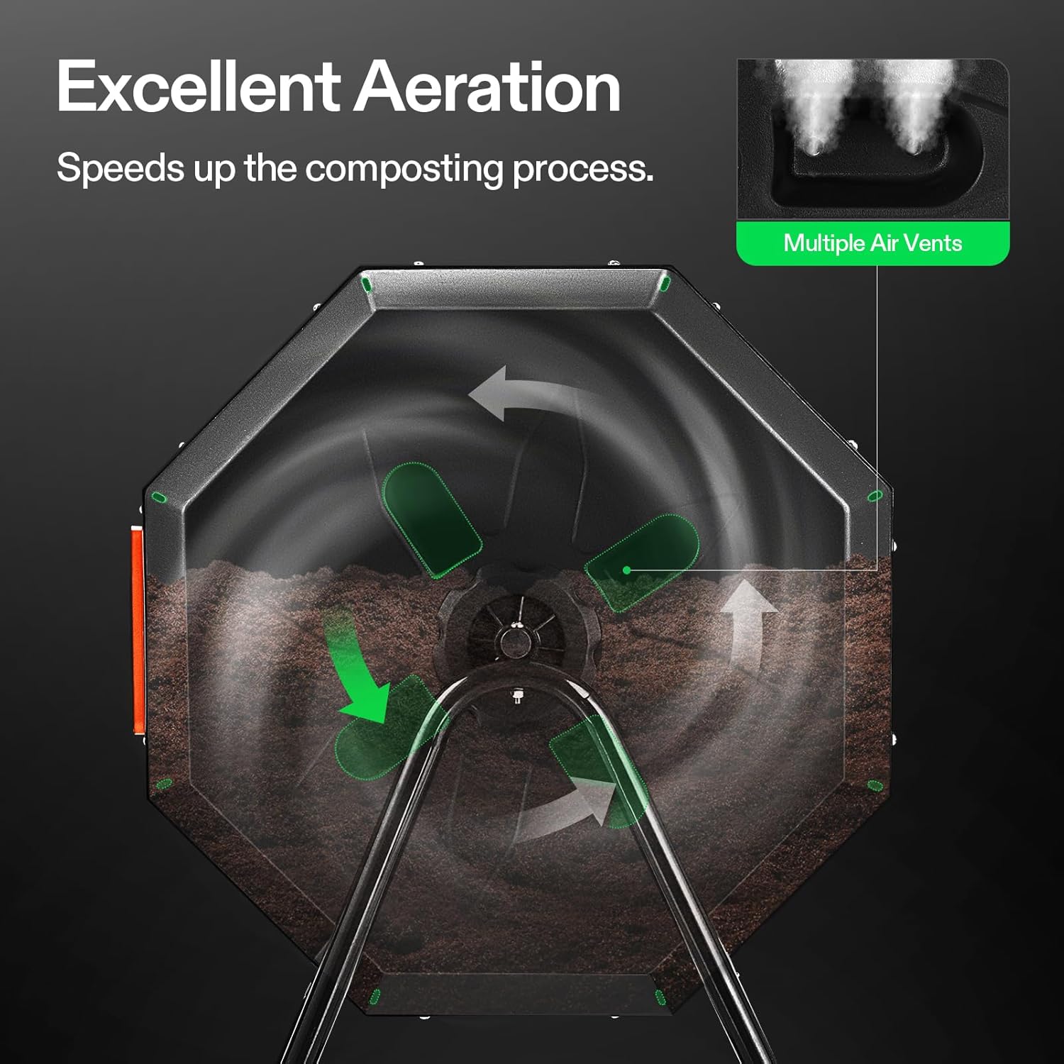 • 360⁰ Tumbling Design: The rotating design prevents you from digging or mixing the pile by hand; And the deep fins on eight panels make it easier to turn the compost bin