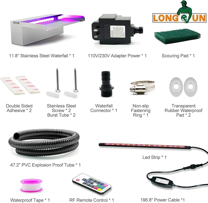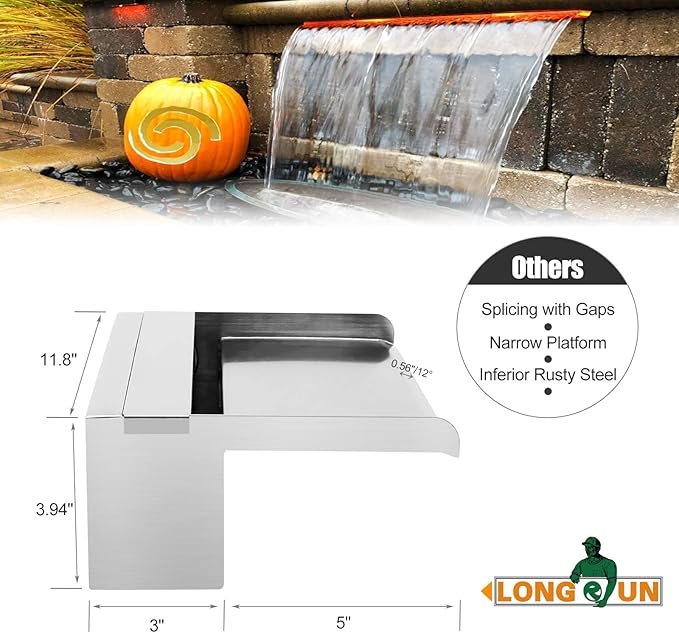 • 【Decoration Waterfall】LONGRUN waterfall spillway will make a decorative addition to your garden patio pond or swimming pool, it makes them more elegant, fashionable and beautiful. The color change of LED lights and the gentle sound of water running make your patio more special at night.