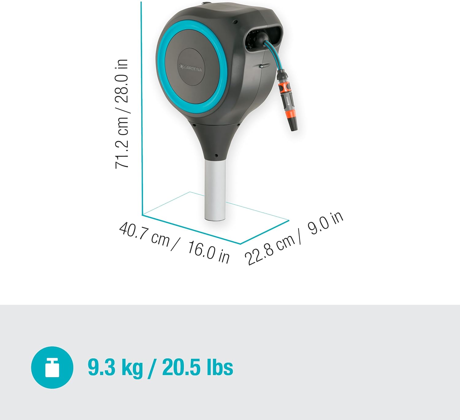• Items delivered: 1x GARDENA Retractable Hose Reel, GARDENA premium hose, Metal spike, mounting rod, 5 ft connecting hose, connection fittings and infinitely adjustable spray nozzle