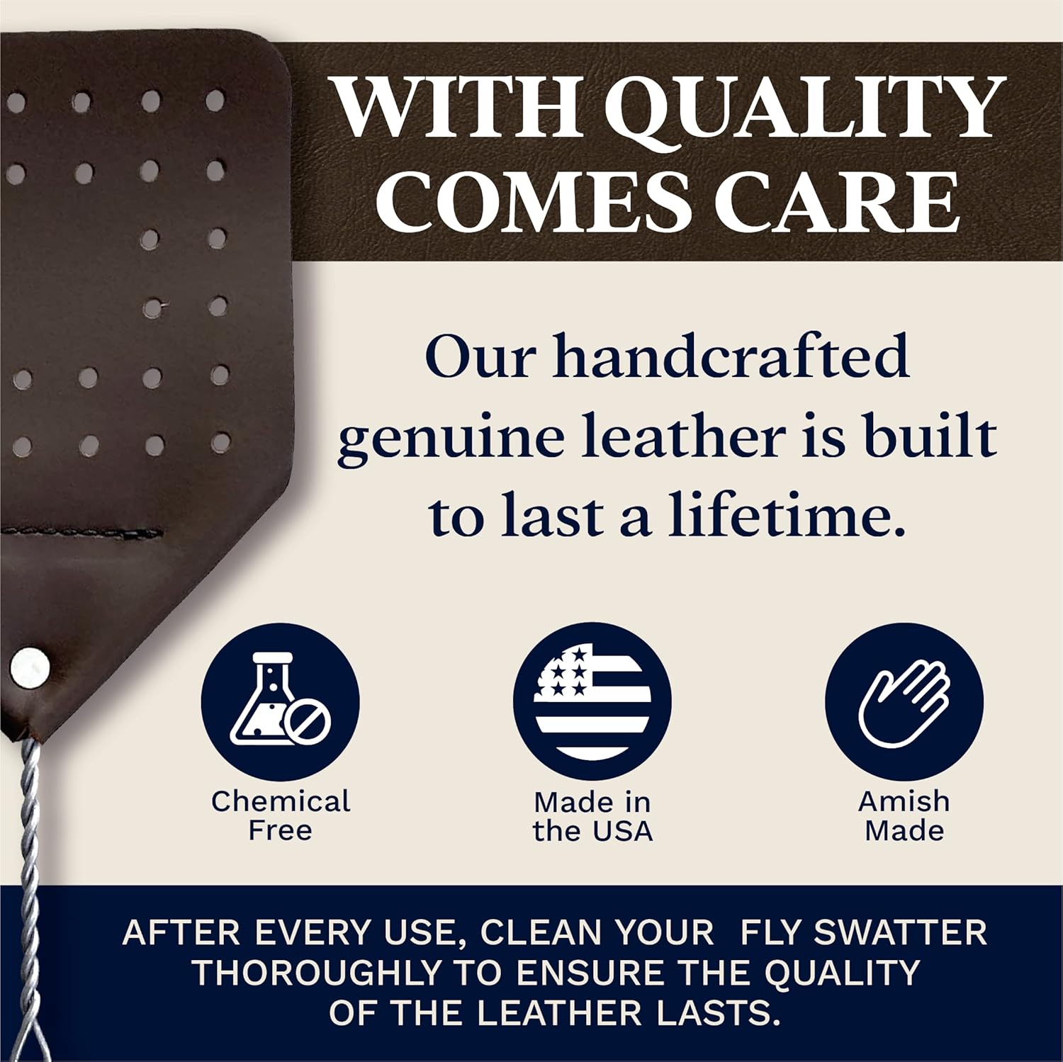 • Leather Fly Swatter Pack: Hope Woodworking’s home, office, and classroom fly swatters are handcrafted with care in the USA to ensure the highest quality. This oversized fly swatter set has flexible metal spring handles, vented swatters, and is 17” long so you can swat pesky bugs and flies while maintaining a comfortable distance.