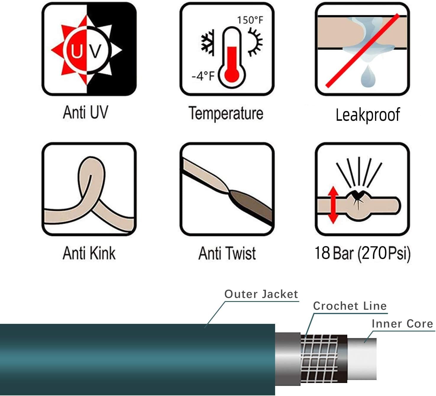 • Anti-Kink Engineering: Engineered to maintain 98% water flow efficiency during prolonged use, our 5-layer construction PVC matrix with helical reinforcement eliminates hose deformation; This kink-resistant solution reduces watering interruptions by 70% compared to standard garden hoses, translating to 15% faster task completion for garden irrigation and vehicle washing applications
