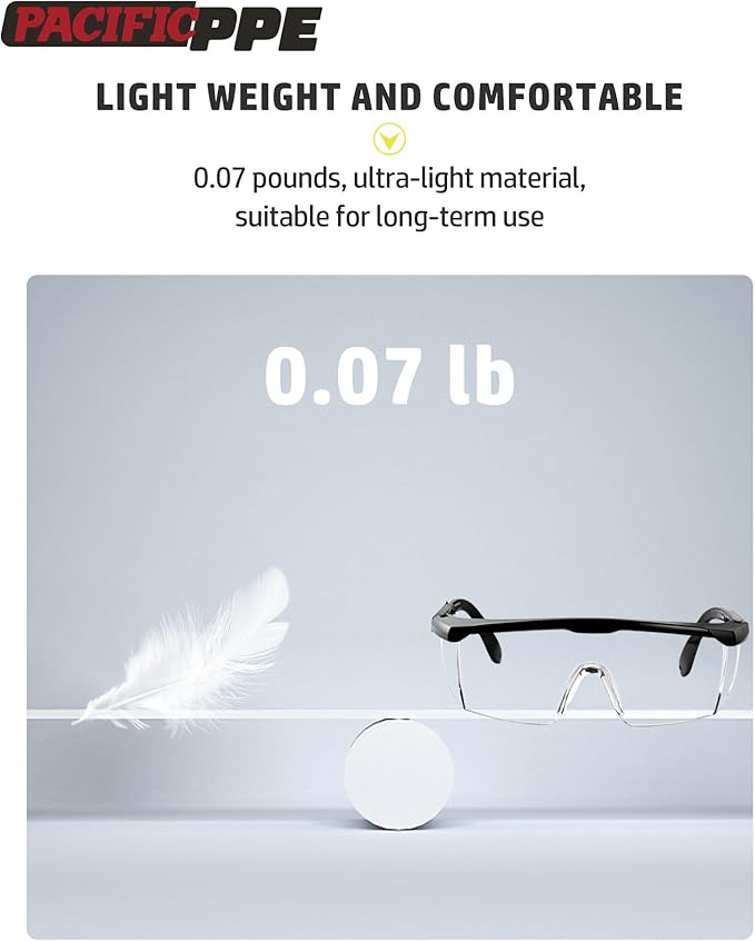 • ๐Ž๐ง๐ž ๐’๐ข๐ณ๐ž ๐…๐ข๐ญ๐ฌ ๐€๐ฅ๐ฅ - The safety glasses are equipped with comfortable nose pad and adjustable temples, featuring an ergonomic one-piece lens design that is comfortable and pressure-free. Each individual can adjust the size and angle of the glasses according to own facial contours to prevent from slipping or causing discomfort during use.