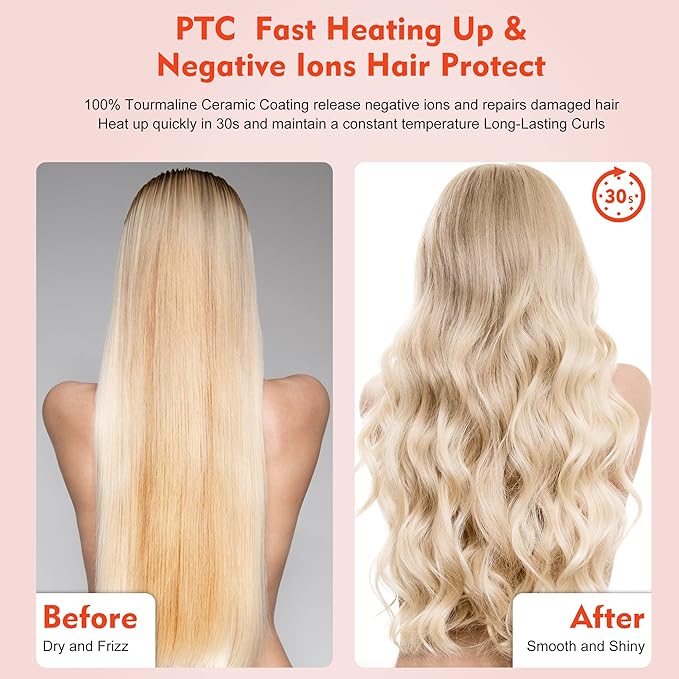 • [ PTC HEAT TECHNOLOGY & TOURMALINE CERAMIC COATING ]: This Upgraded hair curler adopt PTC heating technology, this curler can quickly heat in 60 seconds and lock the hair moisture at the same time. The special ceramic coating curling iron can produce negative ions to eliminate frizz and static electricity to make heat evenly distributed, reduce heat damage to your hair, keep your hair curly and shiny for a long time.