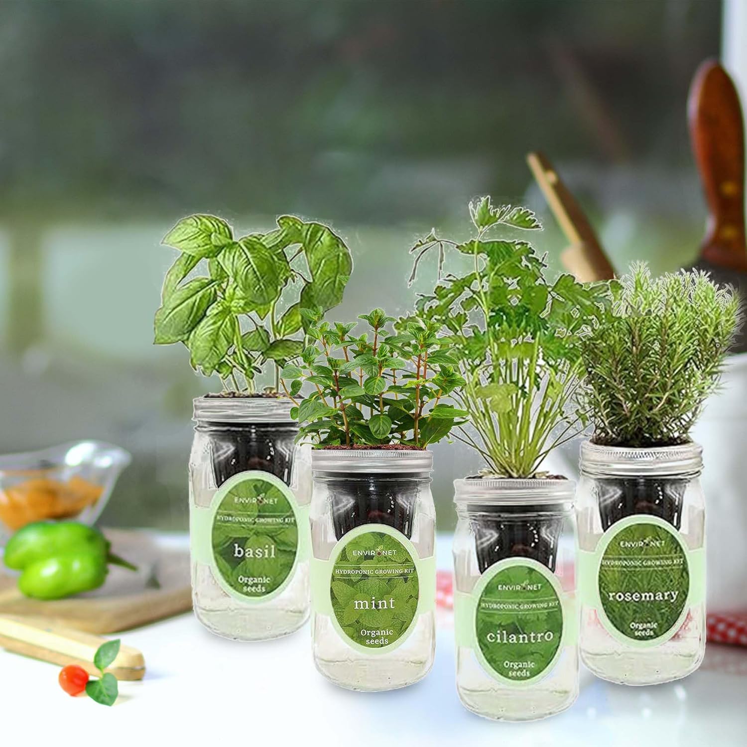 Hydroponic Herb Growing Kit Set, Self-Watering Mason Jar Herb Garden Starter Kit Indoor, Grow 4 Kinds of Herbs from Seeds (Basil, Mint, Cilantro & Rosemary)