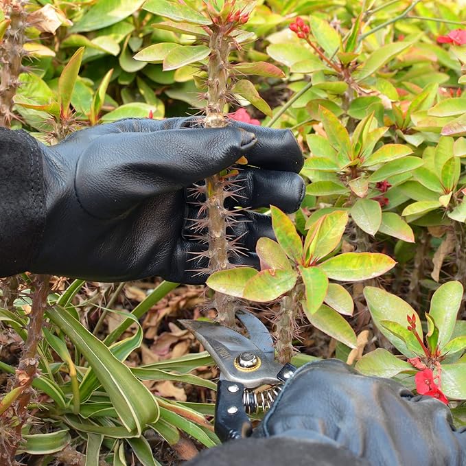 • Heavy Duty Leather Garden Gloves: Genuine leather gloves is thron resistant that will protect your hands safe from rose thorns, thistles, brier plants and so on. Professional gardening gloves for rose pruning and cactus trimming