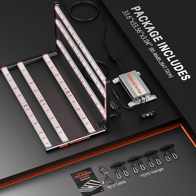 • 【GROW SMART WITH THE SPIDER FARMER APP】Take full control of your grow lights anytime, anywhere with the Spider Farmer App. Simply download the app (available on the Apple Store & Google Play) to unlock powerful features like custom light schedules, sunrise and sunset simulation, and remote brightness adjustments. Even while you're away on vacation, you can effortlessly manage your Spider Farmer SE grow light to ensure your plants thrive without missing a beat