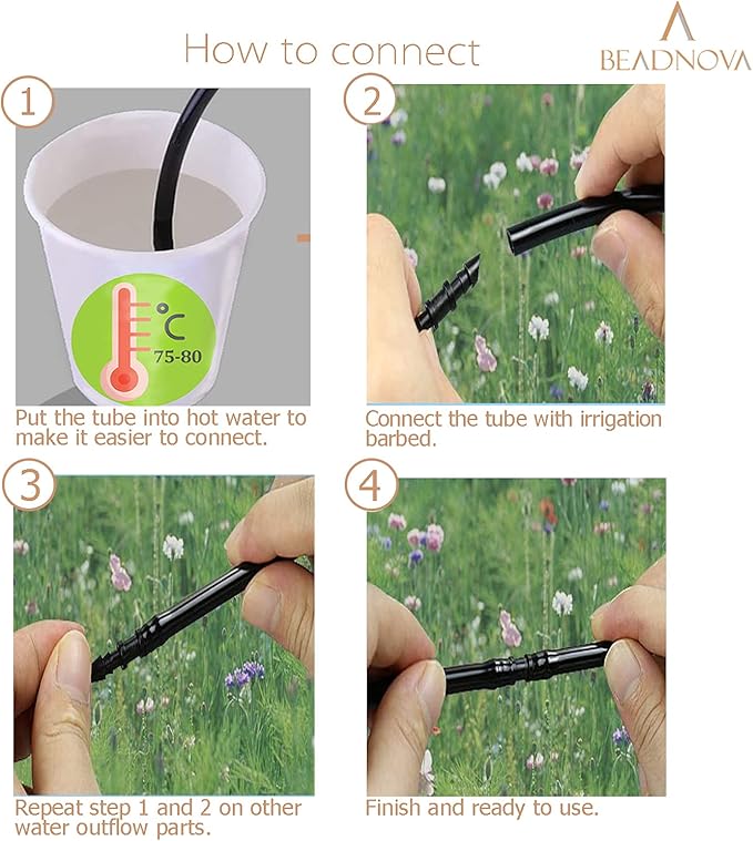 • NO TOOL INSTALLATION: Connect two sections of irrigation tubing by simply insert this barbed connector at the ends of the tube. No tools or glue required. Push the tube firmly into the irrigation barbed to avoid leakage. Soften the end of tube with blower if you find the tube is too stiff before inserting.