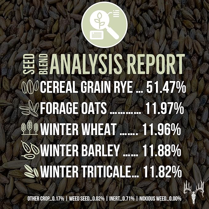 • Winter food plot seed mix of cereal grain rye, defender oats, red field wheat, barley & triticale seeds.