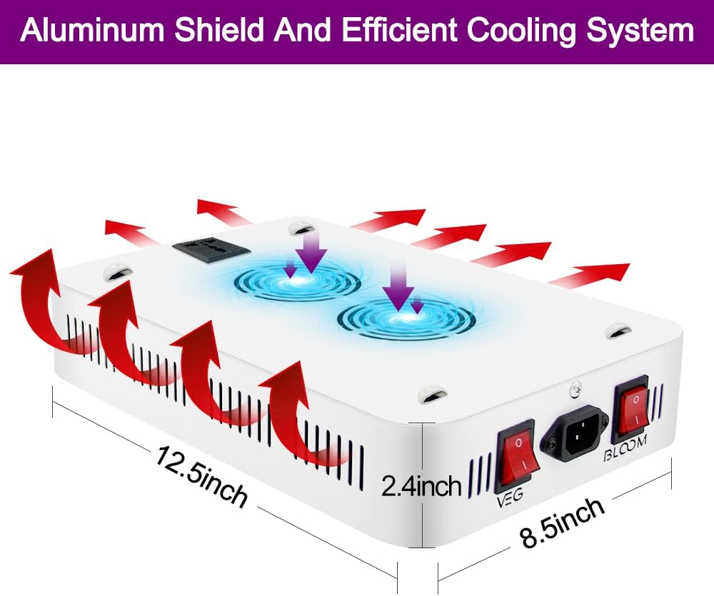 • Efficient Cooling System: The plant growing lamps feature a cooling system with 2 high-speed fans and an aluminum heat-sink. Working at 50 - 60°F, the lighting won't damage plants, enabling longer lighting and safeguards the LED grow light for a long lifespan.