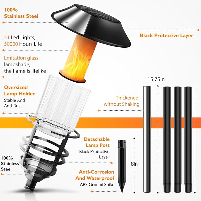 • Bright Shining Flame All Night:The reason for having a long-lasting flame all night and adapting to less light time is that it is equipped with the latest high-tech solar panels, high-efficiency conversion of solar energy, and 51 super bright LED bulbs. It can be charged repeatedly for 50,000 hours