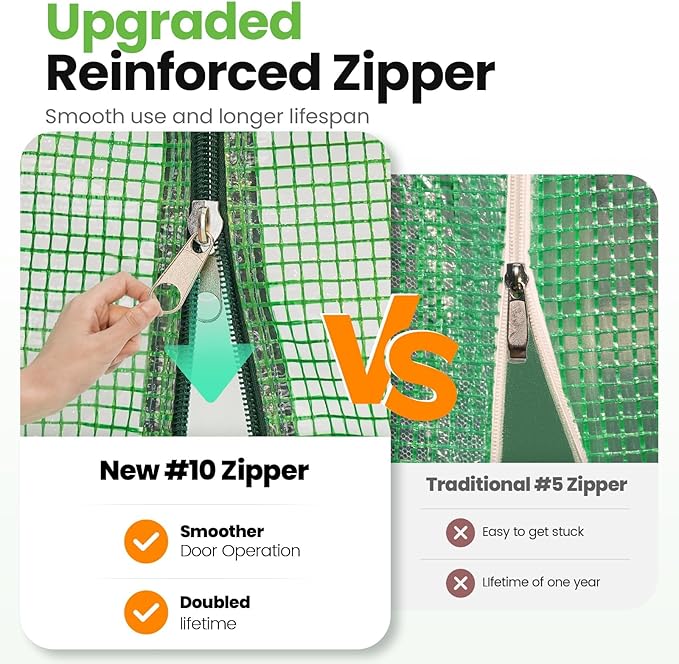 • [UVI 6 Protected Cover]--Our leading waterproof, UV Index 6 protected, and 150g/sqm PE grid cover protects your plants from excess rays, which doubles the service life: Compared to other greenhouse(UVI 1-3) that only lasts for 1-6 months, our KING-cover lasts for over years. The reinforced odorless PE covering material provides safe work zone. The cover fits the frame closely, enhancing warmth and wind resistance.