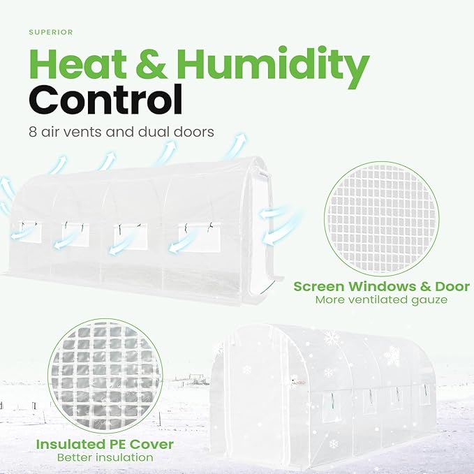 • [Temperature & Humidity Control]--Featured with 8 roll-up screen windows plus 2 door-netting, temperature and humidity can be well-controlled, which increases temperature promoting early spring plant growth, enhances ventilation on hot summer days, and retains warmth during the winter. It keeps plants from pouring rains, winds, and snows.