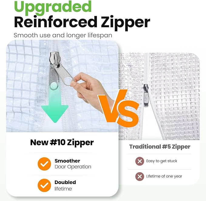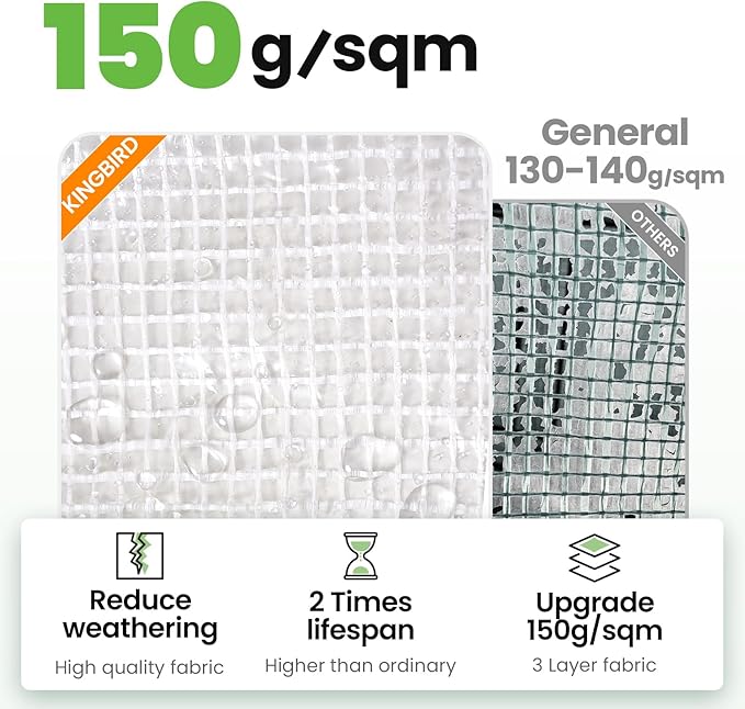 • [UVI 6 Protected Cover]--Our leading waterproof, UV Index 6 protected, and 150g/sqm PE grid cover protects your plants from excess rays, which doubles the service life: Compared to other greenhouse(UVI 1-3) that only lasts for 1-6 months, our KING-cover lasts for over years. The reinforced odorless PE covering material provides safe work zone. The cover fits the frame closely, enhancing warmth and wind resistance.