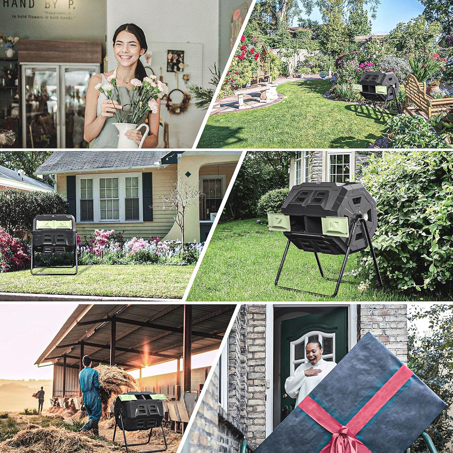 • ๐ŸŒฑTumbler design: The compost tumbler design just need you to rotate it slightly without having to dig, turn, and mix by hand.Only need to open the sliding door and put the scraps into it and rotate it 6-7 times every few days.