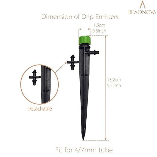 • PACKAGE INCLUDES: 50pcs drip emitter in length around 5.2 inches / 13cm. Each drip emitter has 8 outlet holes at the top which diameter is adjustable between 0.05 inch to 1.4mm approximately. Irrigation sprayer suitable for 4/7mm (inner/outer diameter) hose, or 1/4 inch tube. Color green.