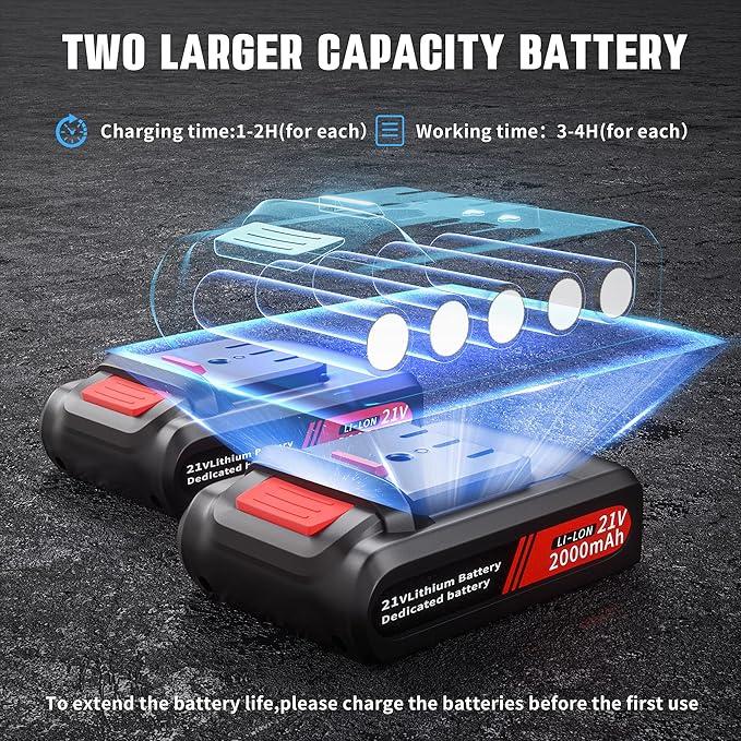• 【Long Life Rechargeable Lithium Batteries】- The electric shears has 2 pack 21V, 2Ah rechargeable lithium batteries, long battery life, 1.5 hours fast charging, continuously working cut about 6000 times after being fully charged.The two batteries can be used in turn.( Notice: The batteries are not fully charged, please charge the batteries before the first use.)