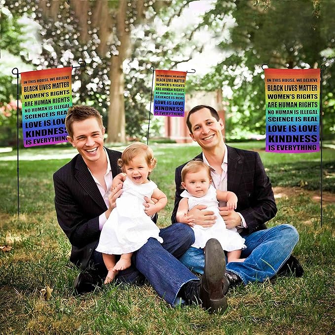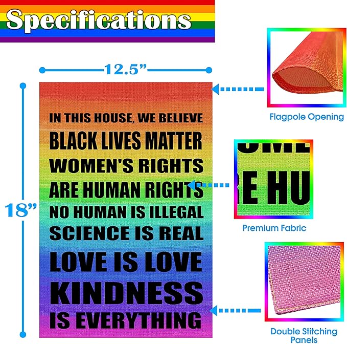 • A Great Gift: This wonderful in This House We Believe Sign flags will be perfect for hanging from your garden, adding decor to your garden, welcoming guests to your front door, or greeting family and friends at your back door. They also make wonderful gifts for your neighbour and friends! Great for everyday, holidays and special occasions! The flag is a proud supporter the LGBTQA Community. Be proud and represent your PRIDE with one of our flags!