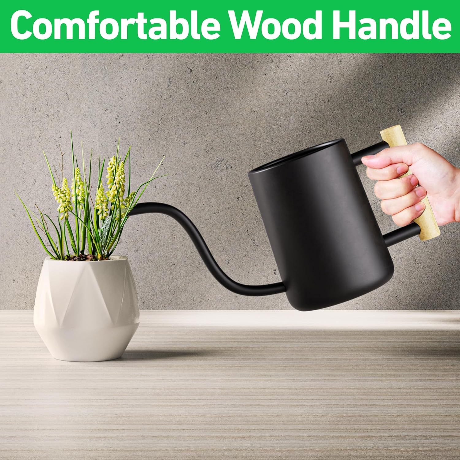 • COMFORTABLE WOODEN HANDLE - Unlike other watering cans for indoor plants which use thin, hard to hold metal handles, this gooseneck watering can has a thick, natural wood handle that is easy to hold and won't slip out of your grip. Make watering your houseplants easy and enjoyable!