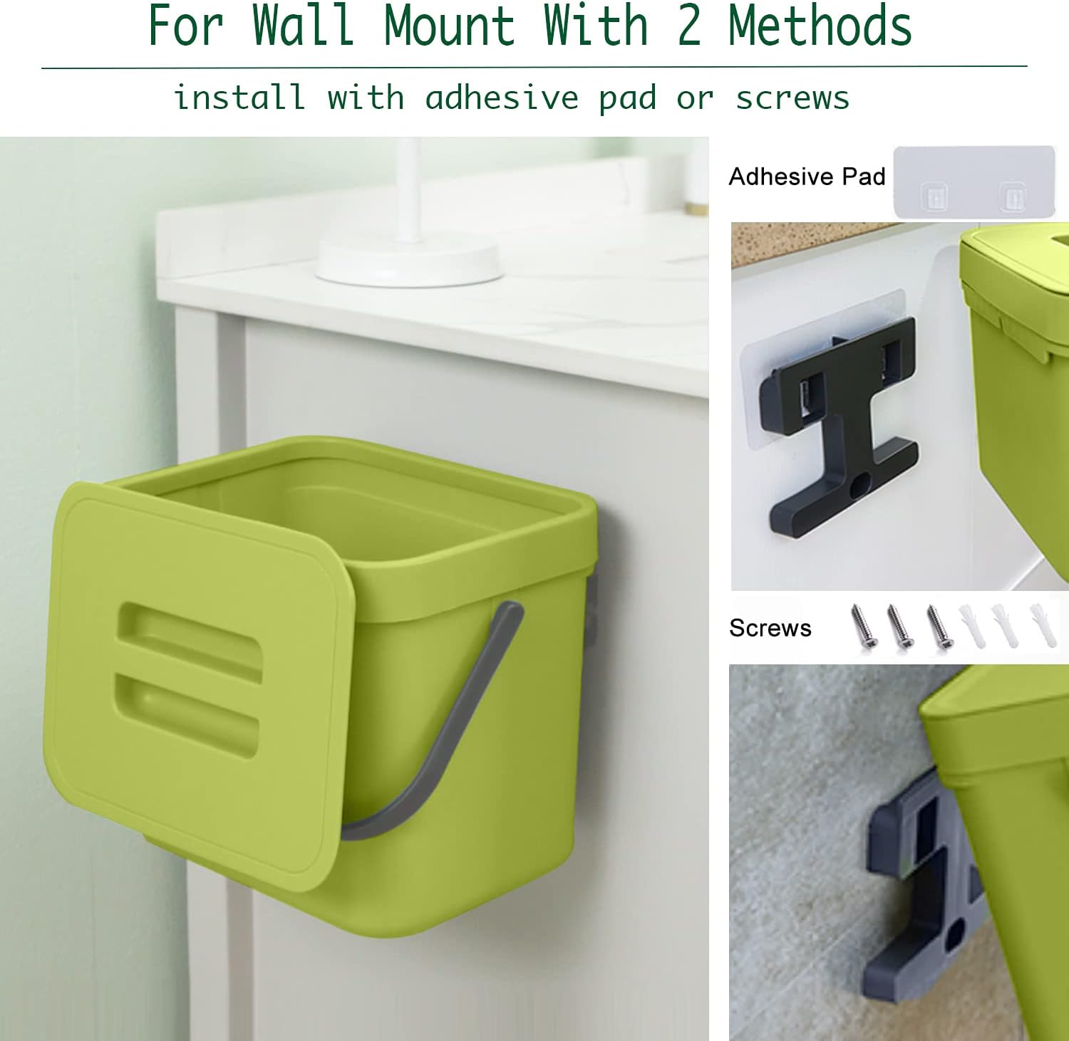 • 【Wall Mount/Under Sink/Countertop Trash Can】The small trash can could be easily hung on kitchen cabinet doors, pantry doors. (The thickness of the door should be less than 0.86 inch) Moreover, this food waste basket can also be wall-mounted to under sinks, cupboard, kitchen wall or bathroom wall with adhesive pad or screws.