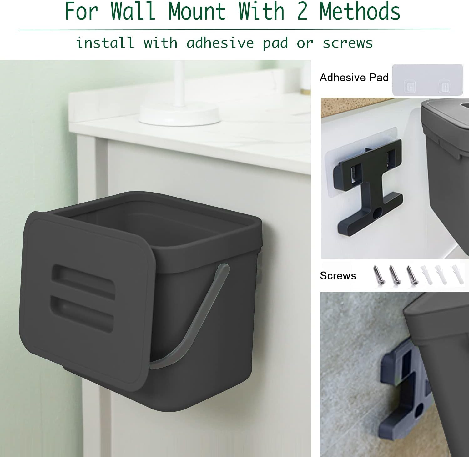 • Wall Mount/Under Sink/Countertop Trash Can: The trash can with lid can be easily hung on kitchen cabinet doors, pantry doors. (The thickness of the door should be less than 0.86 inch) Moreover, this small waste basket can also be wall-mounted to under sinks, cupboard, kitchen wall or bathroom wall with adhesive pad or screws.