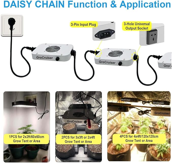 - Daisy Chain Function:Linking (Daisy Chaining) Grocruiser grow light is as simple as plugging them into a wall outlet. You use the same power cords to daisy chain these lights together, so there are no extra wires to keep track of. They interlink easily and quickly. No fuss. Just amazingly simple. (NOTE:Connect Max 4pcs 12000 Lumen plant grow light together.)