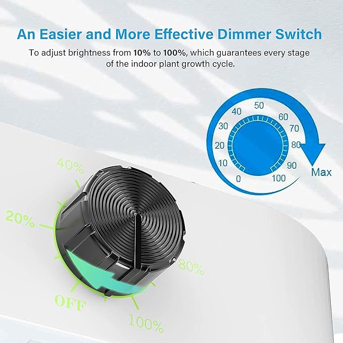 - Adjustable Brightness: Full spectrum led grow light adjustable dimming from 0-100%. You can set brightness plant light at 30%-50% for seed starting or seedlings, 60%-80% for growing, 90%-100% for flowering. Can carry you through all stages of growth. (Fans and work along with the dimming knob. When lowering brightness, it also reduces the fan speeds as well.)
