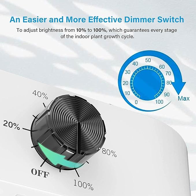 - Adjustable Brightness: Full spectrum led grow light adjustable dimming from 0-100%. You can set brightness plant light at 30%-50% for seed starting or seedlings, 60%-80% for growing, 90%-100% for flowering. Can carry you through all stages of growth. (Fans and work along with the dimming knob. When lowering brightness, it also reduces the fan speeds as well.)