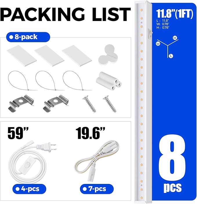 • What You Get: 8 x Barrina T5 Grow Lights, 4 x Power Cords with ON/OFF Switch, 7 x Connecting Cords(20''), 8 x Small Connectors, 16 x Installation Clips, 24 x Double-sided Tapes, 24 x Cable Ties