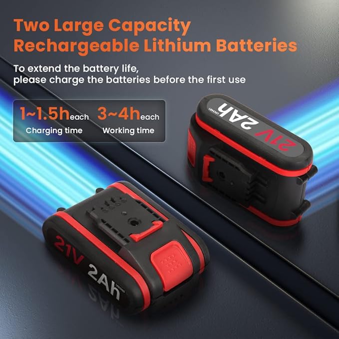 • Lightweight & Durable: Electric branch cutter with battery weigh only 2.2 lbs, so you won't get tired easily after longtime using. The electric tree trimmer have 2 pack 21V, 2Ah rechargeable lithium batteries, long battery life, about 1-1.5 hours of full charge each, and can work continuously for about 3-4 hours for single battery, 6-8 hours for double battery after being fully charged. (Note: please fully charge the battery before use.)