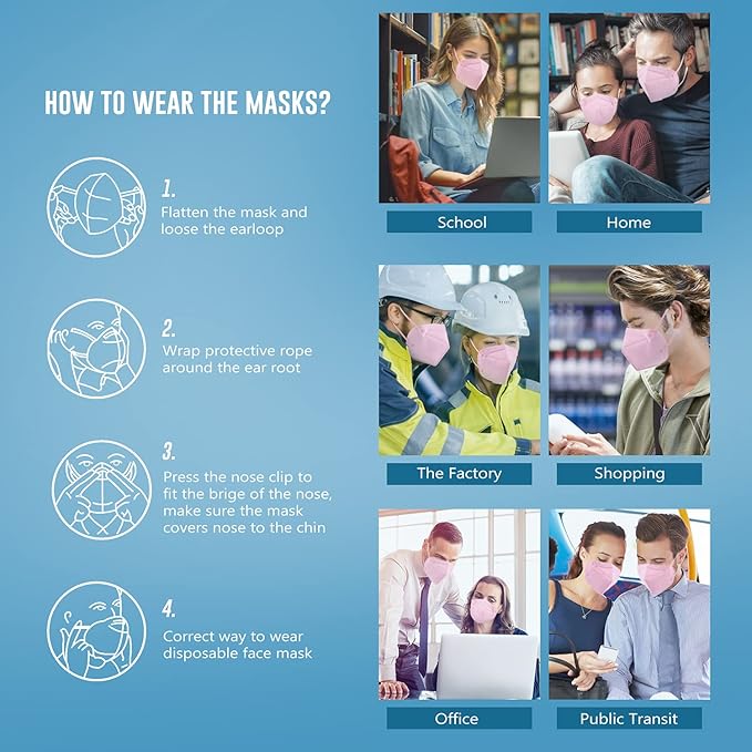 • Powerful Protective Barrier : Not easy to drop, no need to adjust it when you work. Softer elastic ear loop design of the KN95 face mask helps eliminate pressure on the ears for comfortable experience. Adjustable nose clip design can help the mask perfectly attach onto your face. The four sides join tightly to the face; Hence, the protective mask KN95 avoids unfiltered air directly entering into.