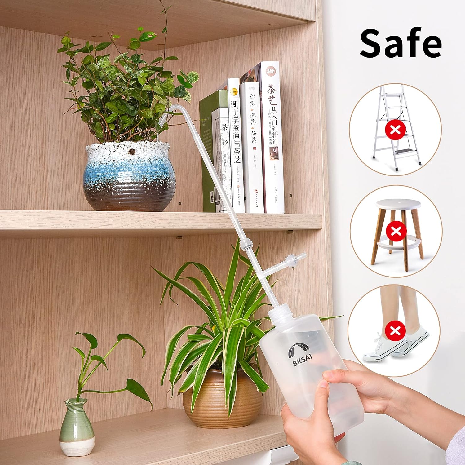 • Squeez out all water in the watering bottle. There is a advanced solution by BKSAI plant watering can for air to get in bottle to take up the space as water goes out, so when you push the watering can back into shape after every squeeze, the water you have forced in the long watering spout will be still there. So that you can use the whole bottle breezily instead of hardly tilting or frequently refilling the plant waterer