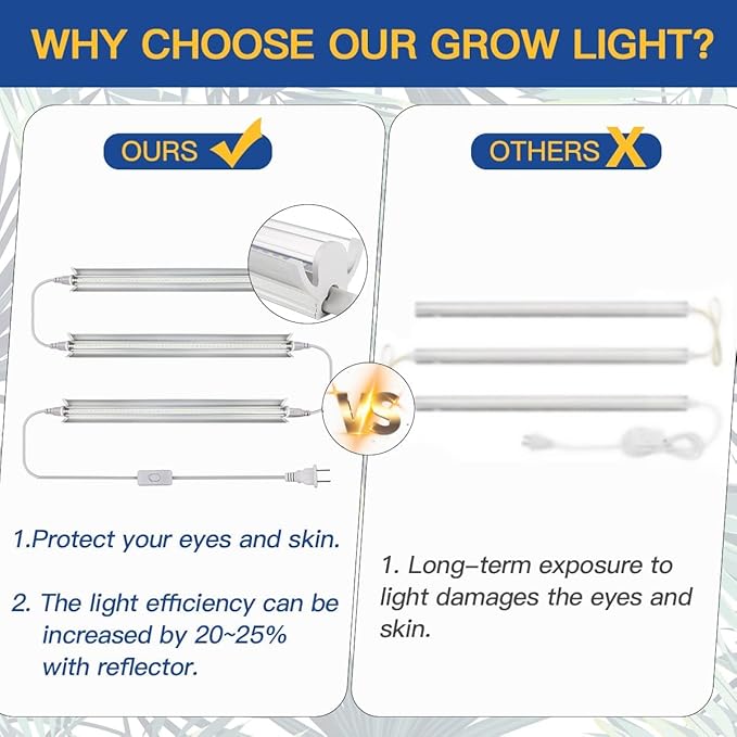 • ๐ŸชดV-shaped Reflector Design - Compared with other indoor plant light strips without reflector, GYTF's hanging grow light has better heat dissipation, and the light efficiency can be increased by 20~25%, It is a great option for your cabinet and shelf plants.