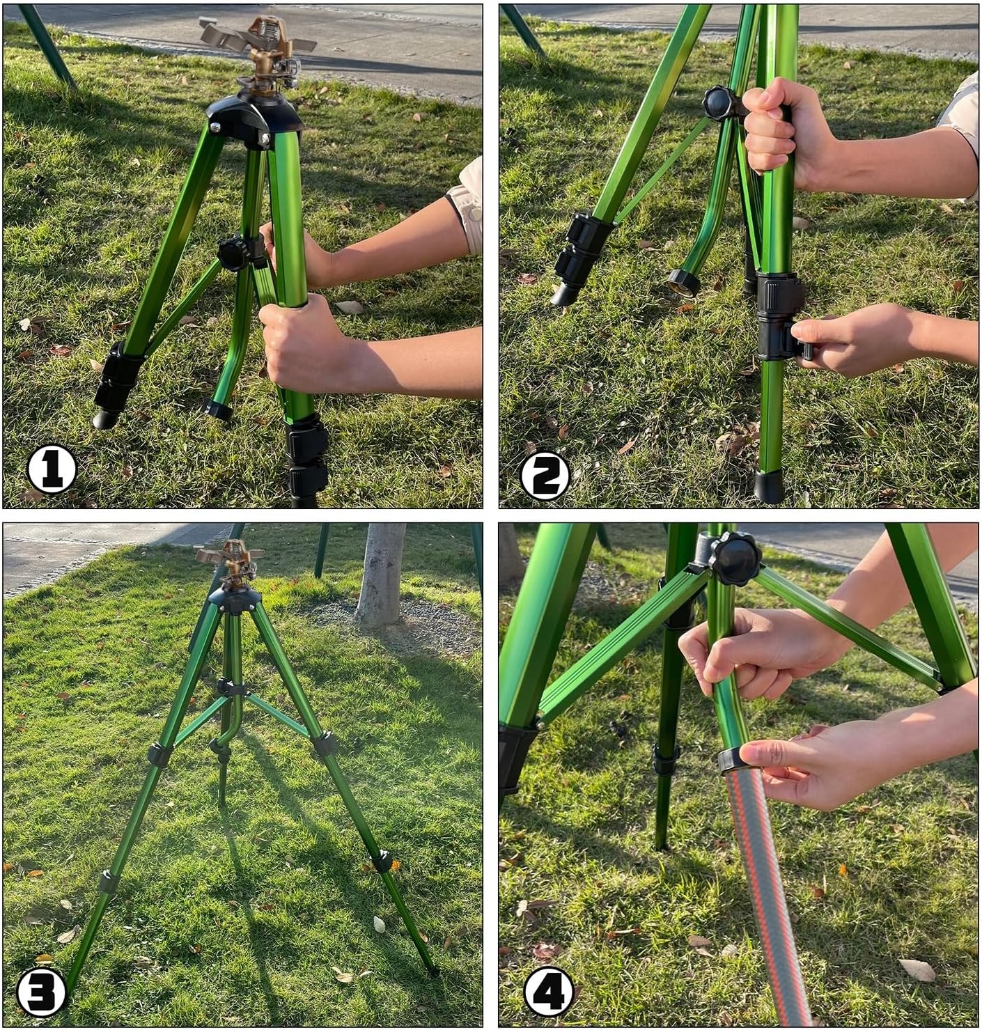 • SUPERIOR QUALITY: Our tripod garden sprinkler is made of high quality material. Heavy duty brass sprinkler head and solid alloy metal tripod look polished and robust very sturdy, rust-proof for a long term use.