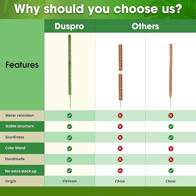 - πͺ΄πππππππππππ ππππππππ π πππππππ: Each moss plant pole is meticulously handcrafted by skilled artisans in Vietnam, ensuring a premium finish with great attention to detail. The Duspro moss pole not only provides strong support for climbing plants but also enhances the aesthetic of your plant display, turning it into a stylish, eye-catching green corner.