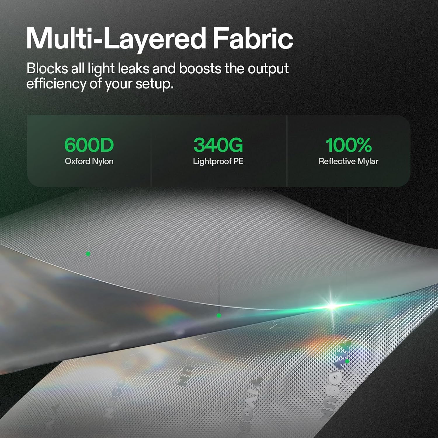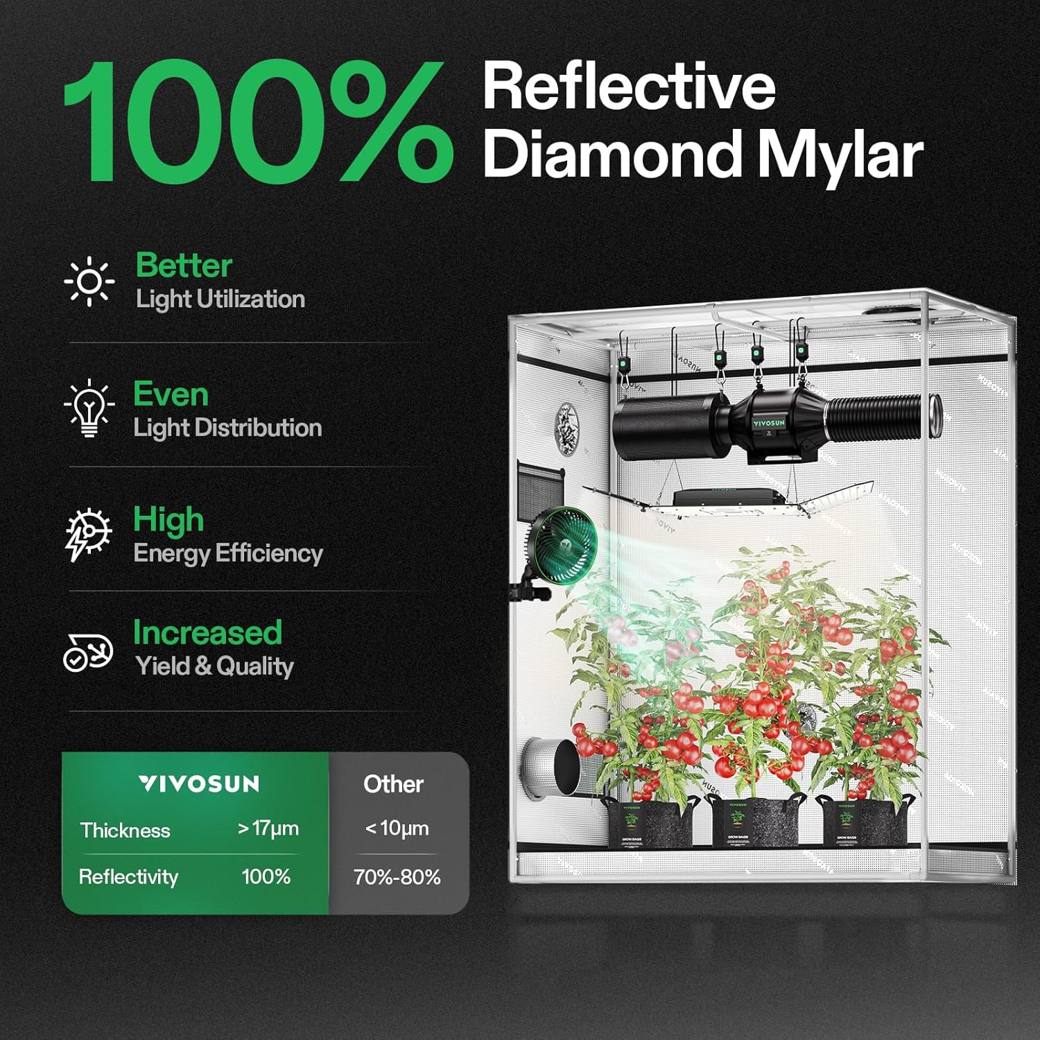 • 100% High Reflectivity: High density 600D Oxford fabric prevents light leakage and keeps your grow area well-insulated; The interior walls, ceiling, and floors are all lined with 100% diamond reflective mylar for multidimensional lighting