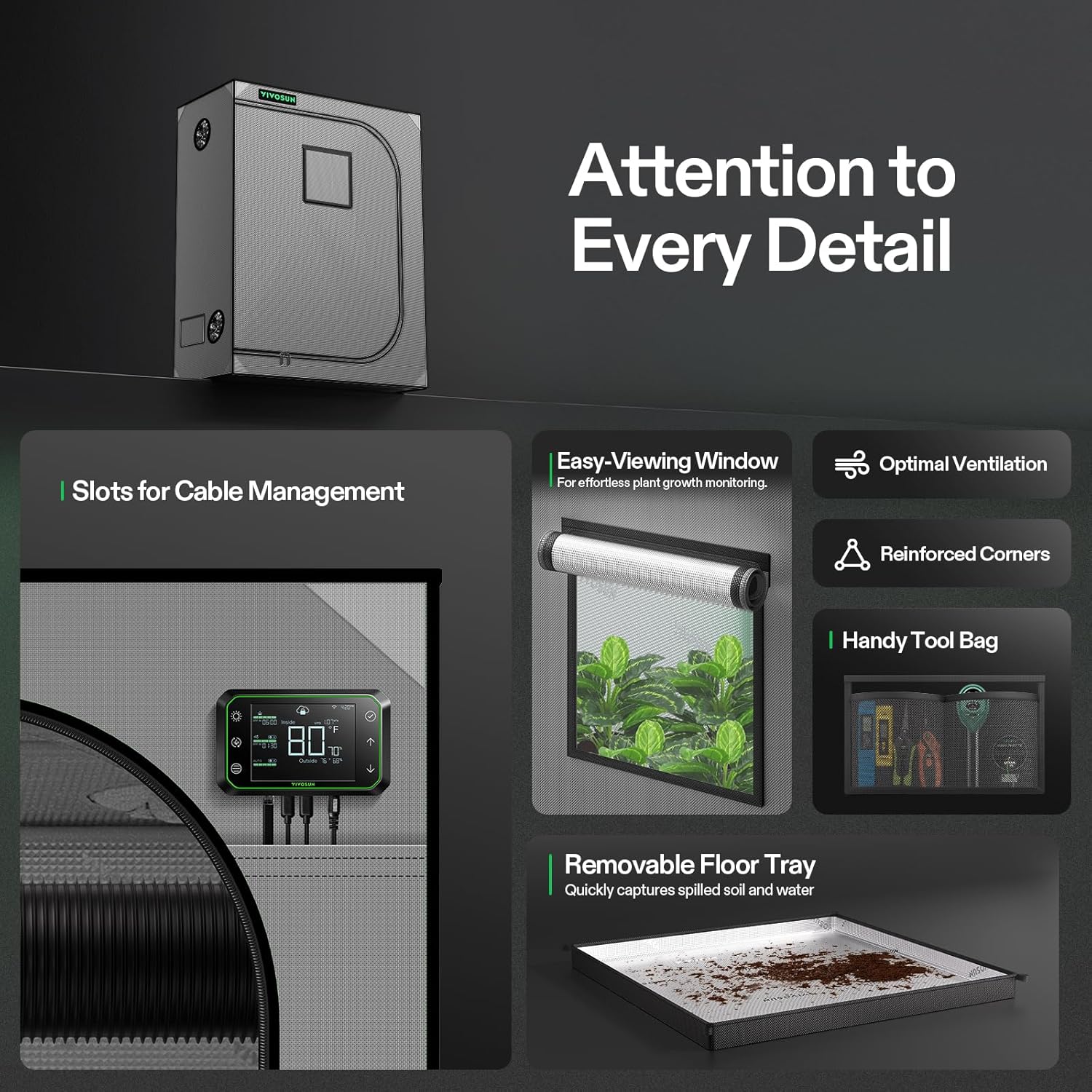 • Observation Window + Removable Floor Tray: Our easy-access observation window makes it easy to observe your plants; The detachable floor tray captures any spilled soil and keeps the tent clean