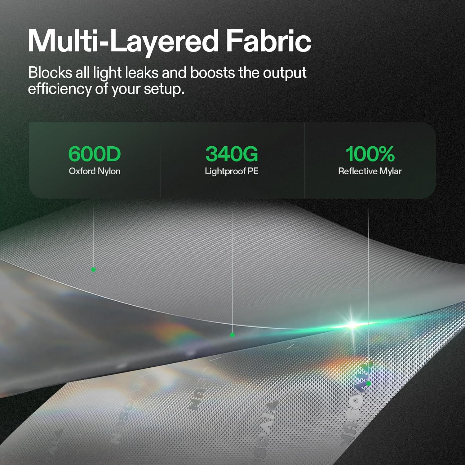 • 100% High Reflectivity: High density 600D Oxford fabric prevents light leakage and keeps your grow area well-insulated; The interior walls, ceiling, and floors are all lined with 100% diamond reflective mylar for multidimensional lighting