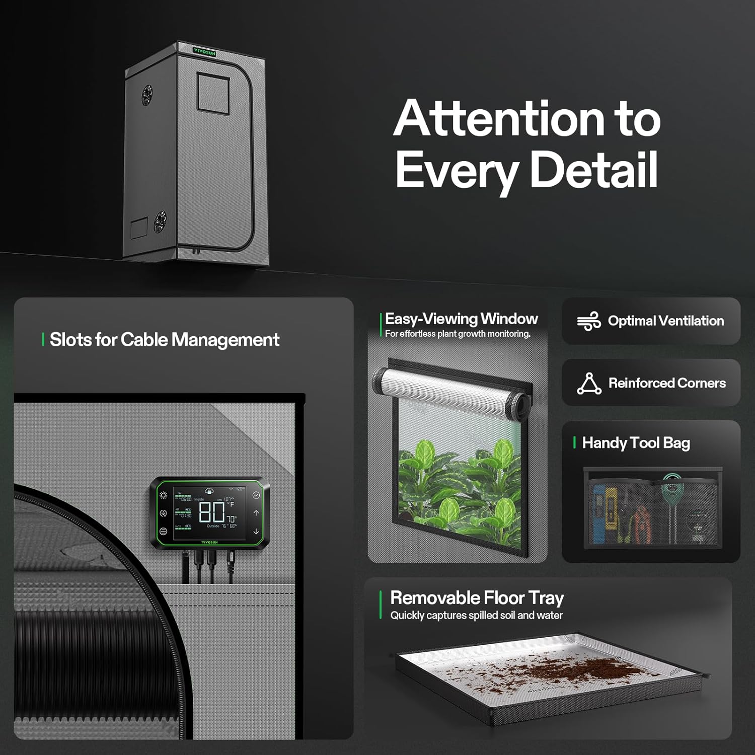 • Observation Window + Removable Floor Tray: Our easy-access observation window makes it easy to observe your plants; The detachable floor tray captures any spilled soil and keeps the tent clean