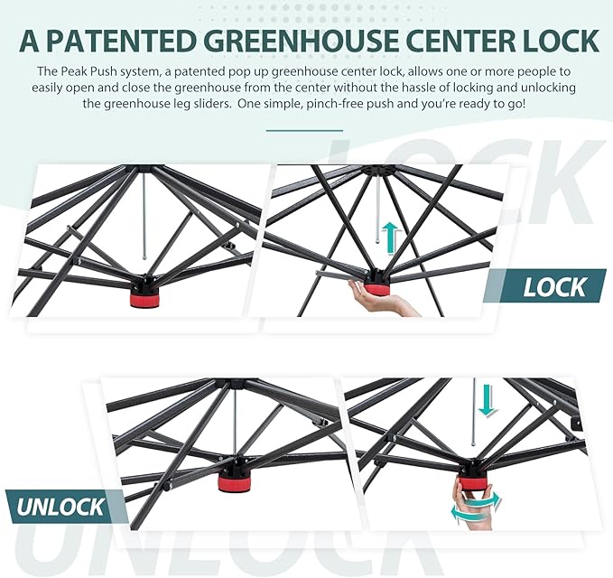• EASY SETUP: This easy setup pop up greenhouse plant tent features the Peak Push system, a patented greenhouse center lock. The portable greenhouse requires no tools and easily opens and closes from the center in seconds. Its unique greenhouse center lock enables a quick, one person setup, letting you maximize gardening with minimal effort