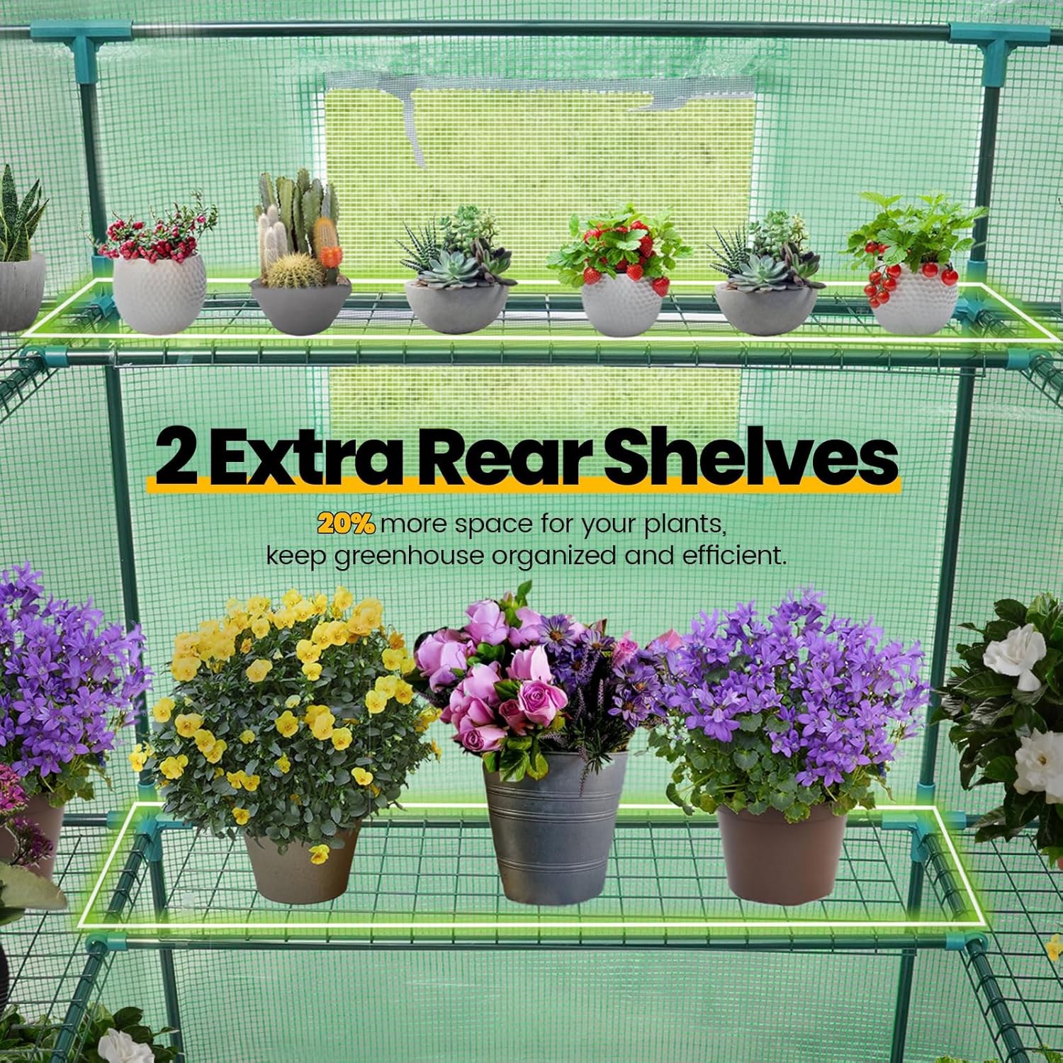 • [More Plants To Place Than Ever] --2 shelves on the back and 12 side shelves of this greenhouse can contain more stuff than normal shelves. Upgraded steel wire shelves, high hardness connectors and powder-coated steel poles make higher load-bearing capacity possible (MAX 46 lbs/shelf, others: 15-20 lbs/shelf).