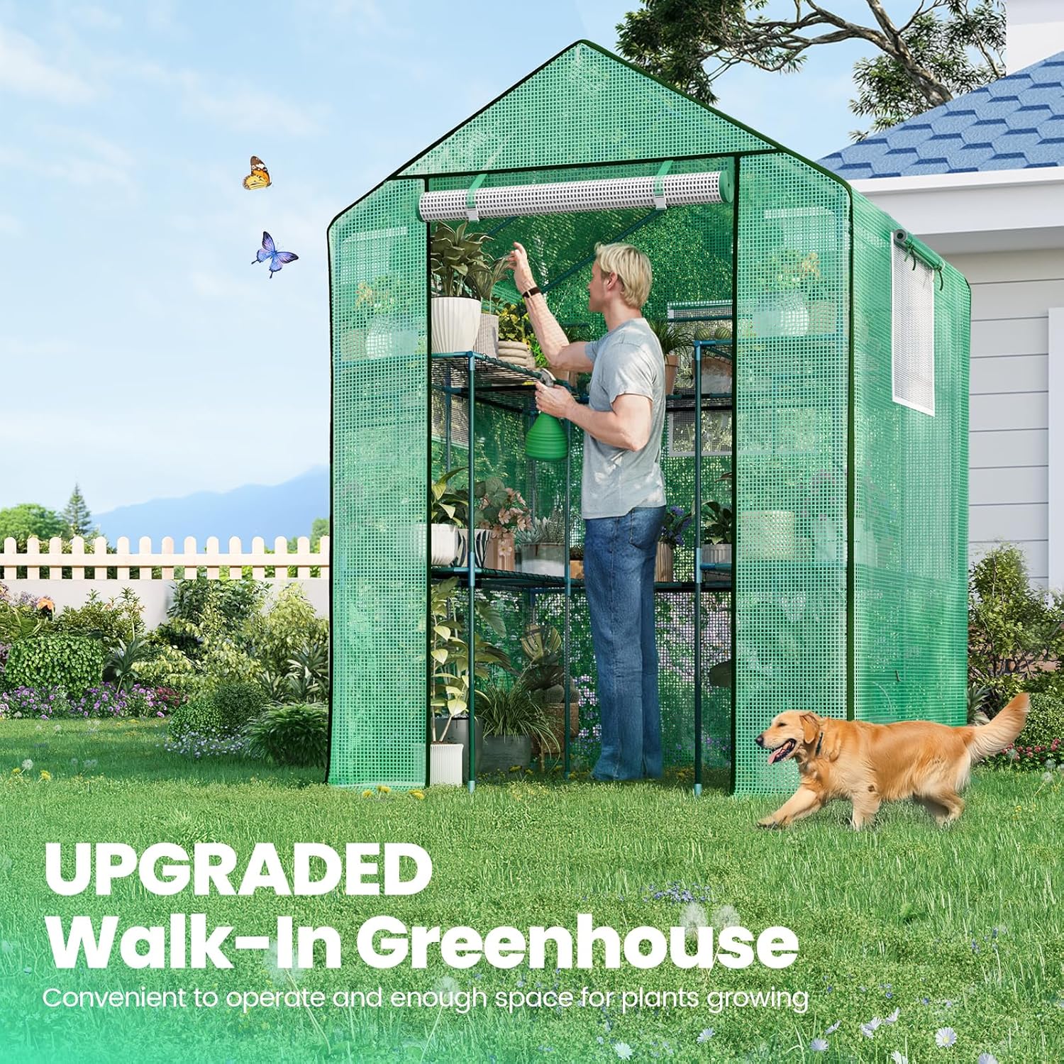 • [Zipper Mesh Door and Screen Windows]--The roll-up door and 3 mesh windows help to control the temperature and humidity when weather changes. The walk-in greenhouse can maintain higher temperatures when fully closed, and cool down by rolling up all windows and door.