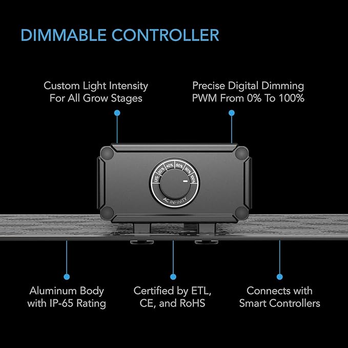 • Dimmer enables 0 to 100% brightness. Can connect with our smart controllers to access grow cycles, scheduling, and app.