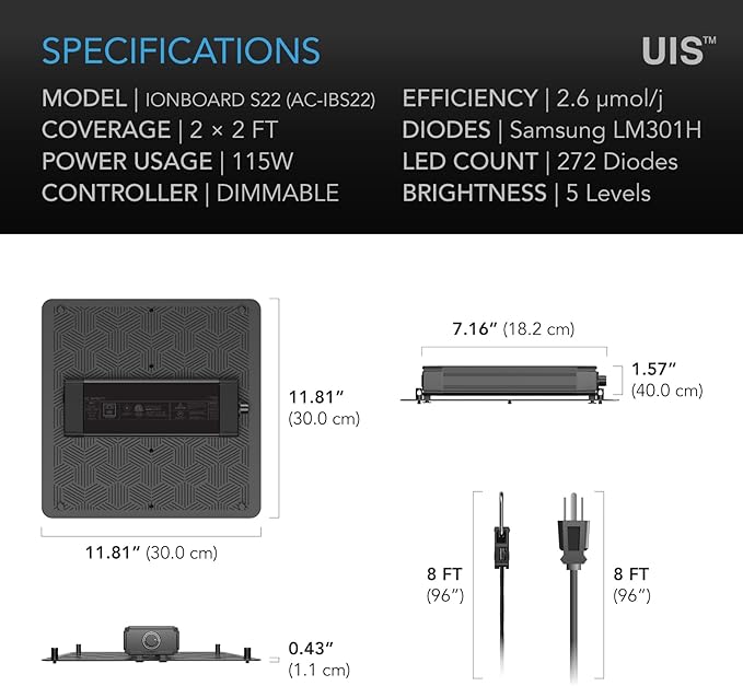 • Utilizes full-spectrum Samsung LM301H LEDs to achieve powerful lighting optimized for all plant stages.