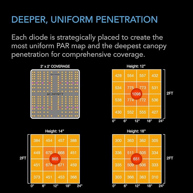 • Algorithmically positioned diodes create the most uniform PAR map and the deepest canopy penetration.