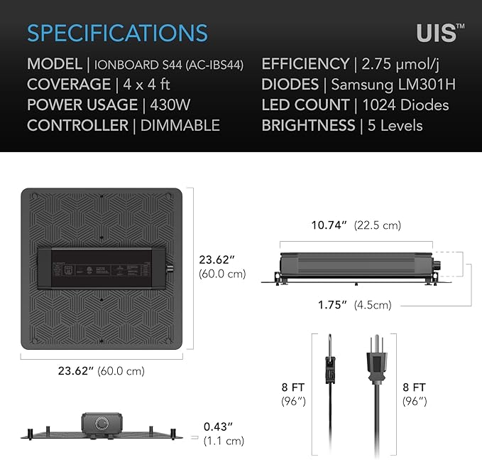 • Utilizes full-spectrum Samsung LM301H LEDs to achieve powerful lighting optimized for all plant stages.