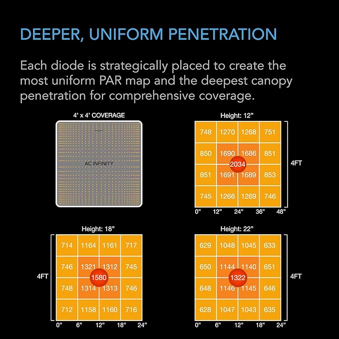 • Algorithmically positioned diodes create the most uniform PAR map and the deepest canopy penetration.